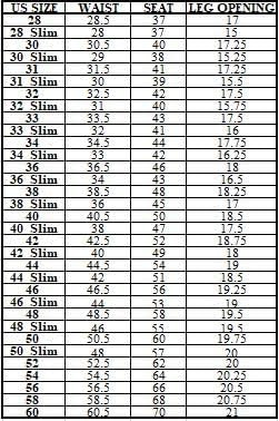 29W x 29L, 29W x 34L, 30W x 32L, 31W x 30L, 33W x 32L, 34W x 32L, 38W x 32L, 40W x 30L, 40W x 32L, 48W x 34L, 50W x 30L, 50W x 34L, 52W x 29L, 52W x 32L, 52W x 34L, 54W x 32L, 54W x 34L, 58W x 32L, 60W x 34L |
