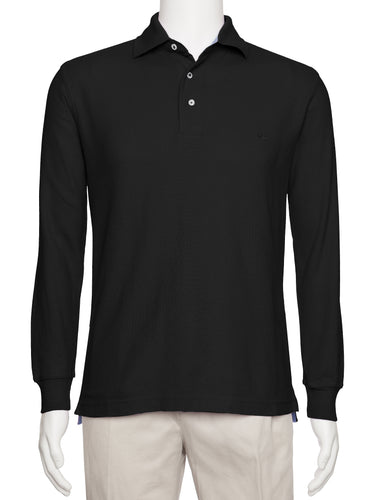 Men's Black Solid Polo Shirt Classic Fit - Pique Chambray Collar- large sizes- Long Sleeve