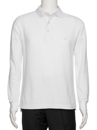 Men's White Solid Polo Shirt Classic Fit - Pique Chambray Collar- large sizes- Long Sleeve