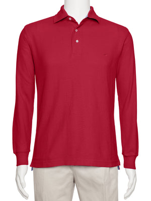 Men's Red Solid Polo Shirt Classic Fit - Pique Chambray Collar- Long Sleeve